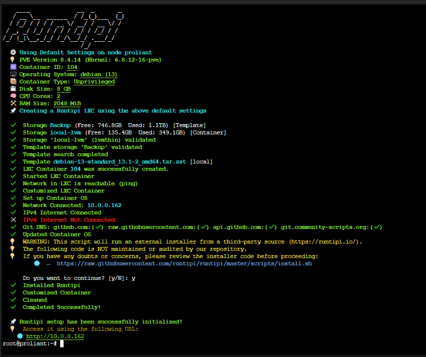 To create a new Proxmox VE Runtipi LXC, run the command below in the Proxmox VE Shell.